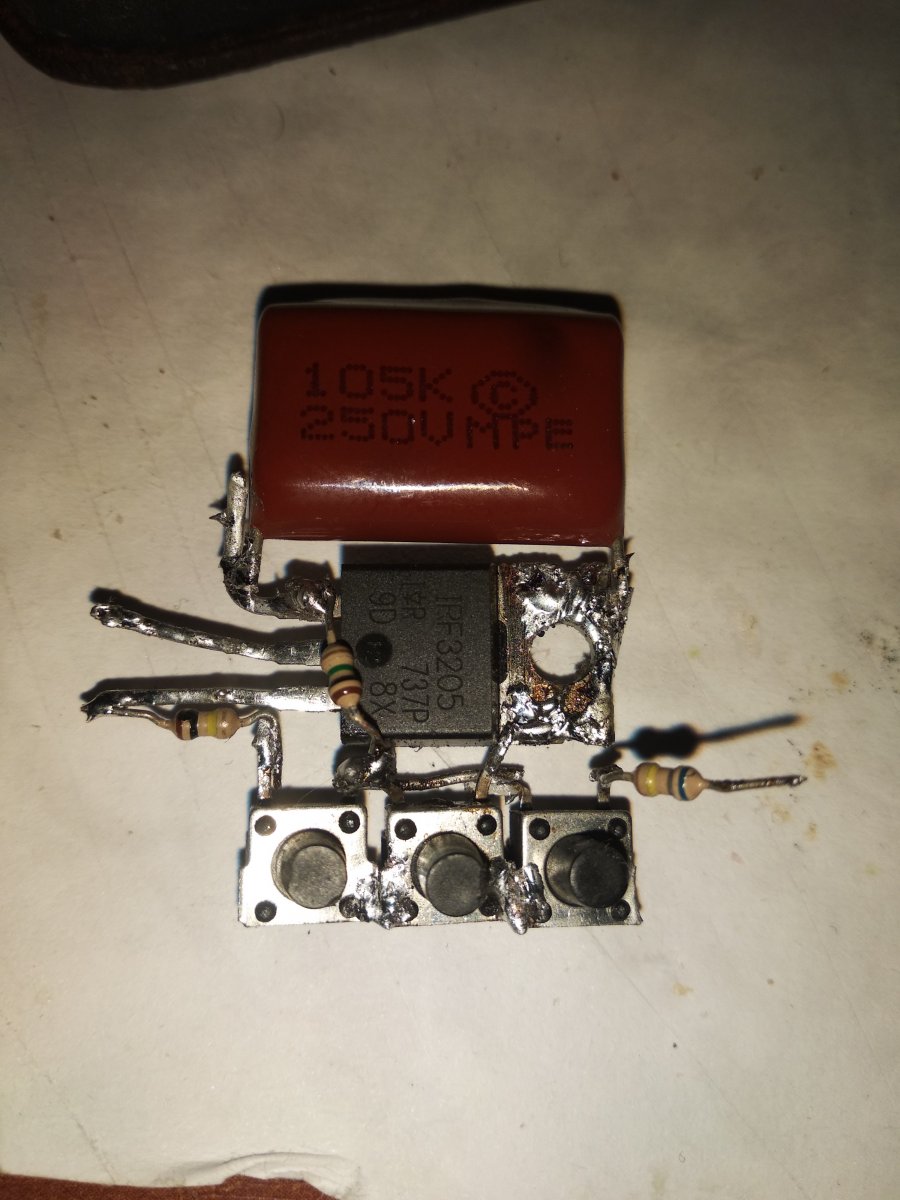 Принцип работы регулятора очень прост. При помощи кнопок конденсатор заряжается, либо разряжается. Так как он подключен паралельно затвору транзистора, то от него зависит насколько открыт полевой транзистор.