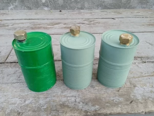Ничего сложного в предстоящей работе нет, если всё правильно подготовить. Олово, при пайке, само расползается по луженым площадям и полосам. Для начала подготовим банки. Их понадобится три. Я просто купил в магазине три понравившихся мне рыбных консервы, в одинаковых банках, съел их, и получил требуемый материал. Берём открывалку, и открываем консервы. Первую, как положено – сверху, это будет нижняя часть. Вторую – со дна, это будет верхняя часть. И у третьей надо удалить и верх, и дно – это будет середина. Далее, примеряем банки друг к другу; выставляем их как можно ровнее, и отмечаем маркером места стыков. Теперь нужно удалить пищевой лак с жести в тех местах, где металлические части соприкасаются. На всех деталях. Можно напильником, я же, использовал гравер для быстроты процесса. Очищенные места обрабатываем флюсом, и тщательнейшим образом лудим их, не жалея олова. Теперь нужно впаять в верхнюю часть будущей бочки резьбу. Это немаловажно! СНАЧАЛА необходимо впаять резьбу, потом приступать к спаиванию остальных частей. Если оставить резьбу напоследок, то газам от пайки, внутри бочки, некуда будет деться, и они оставят множество пор в запаянных швах. Вся наша работа окажется пустой – бочонок будет протекать, как дуршлаг! Итак, отмечаем маркером на верхней крышке бочонка место, где должно находиться горлышко. Вырезаем гравером отверстие на 6 мм. Примерно там же, где и у настоящей бочки. Лудим края отверстия, лудим основание резьбы, и припаиваем резьбу к отверстию. Вот так: Ждём, пока остынет, и можно приступать к основной сборке. Тут всё проще простого! Требуется лишь нагреть паяльником состыкованные части бочонка, и успевать подавать на стык олово. Остальное всё сделает гравитация – равномерно распределит тяжелый припой по всему периметру во всех луженых местах. И, тем не менее, все равно потом нужно внимательно осмотреть спаянный стык. Протереть его растворителем, удалив копоть и остатки флюса, и добавить олова в тех местах, где его мало. Так же следует пропаять и все заводские швы – во время нагрева они неизменно деформируются и, в дальнейшем, могут начать протекать. После спайки частей, в единое целое, нужно удалить напильником все выступившие наружу застывшие капли припоя. На том основная сборка закончена. Теперь можно заняться заключительными работами; подгонкой крышечки, проверкой на герметичность, и покраской. У меня колпачок имел сквозное отверстие. По этому, я просто гравером срезал у него конусную верхушку, и впаял на это место листок латуни. Вот что получилось: Осталось проверить на герметичность, и покрасить бочонок. Берём насос, накручиваем шланг на резьбу бочонка, отпускаем бочонок в воду, делаем пару качков, и внимательно наблюдаем. Протечка, если она имеется, сразу себя обнаружит пузырьками воздуха. У меня всё прошло гладко с первого раза – ни единого пузырька. Если у кого обнаружится протечка, нужно пометить это место мелом и, когда высохнет вода, нагреть его паяльником и добавить туда олова. Течь будет устранена. Теперь покраска. Так как я собираюсь использовать эту флягу для транспортировки горючего – спирта для примуса, или жидкости для розжига, то и лакокрасочное покрытие должно быть устойчиво к растворителям. Подобрав нужную эмаль, начинаем покраску. Берём клок губки, макаем одну треть его в эмаль, и поступательн