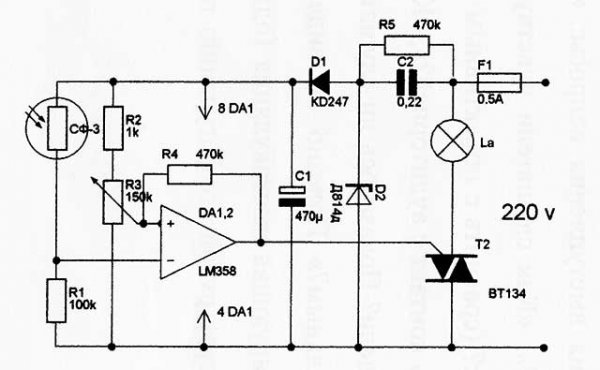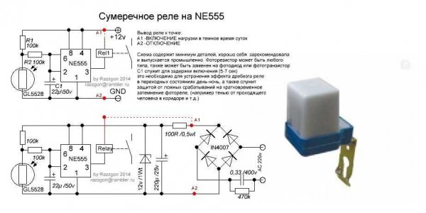 В данном фотореле используется гистерезис, что позволяет избавиться от мерцания лампы во время восхода и заката. Конденсатор на плате служит защитой от ложных срабатываний, то есть задаёт время задержки включения или отключения лампы. Его емкость может быть любой.