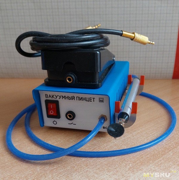 Работать таким устройством очень приятно. Рукоятка легкая, рука не устает, нет опасности, что компонент, даже самый мелкий, соскочит. Можно их четко позиционировать на плате. С присосками подойдет для демонтажа даже крупных компонентов, мощности хватит. Присоски можно изготовить и самому, к примеру из термостойкого герметика.