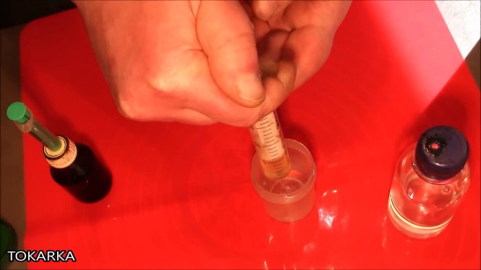 На упаковке у нее всегда указана пропорция отвердителя к смоле. Добавляем к 15 куб.см смолы 1,8 мл отвердителя, тщательно перемешиваем и выдерживаем около 1 часа. При добавлении в микст немного ацетона увеличивается текучесть смеси и уменьшается скорость отвердения.