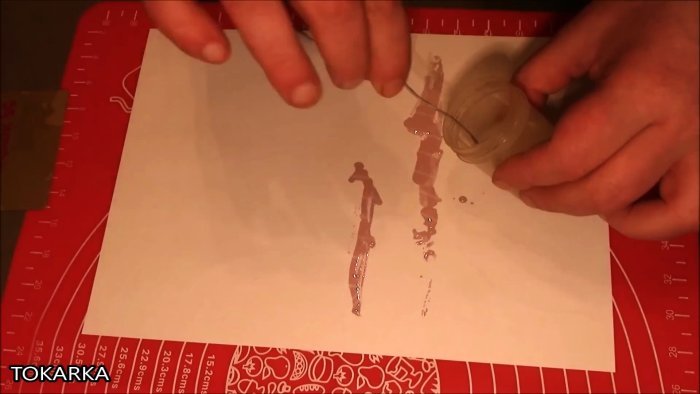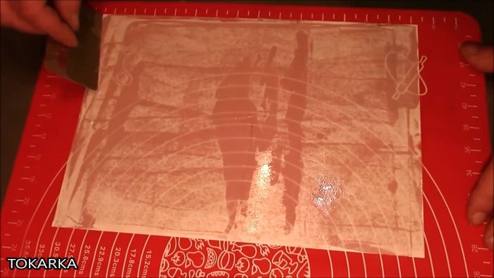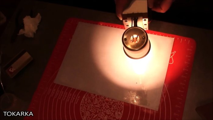 Приготовленной порции эпоксидной смолы хватило на 8 листов формата А4. Для удаления остатков воздуха заготовку прогреваем галогеновым светильником, инфракрасным нагревателем или феном.