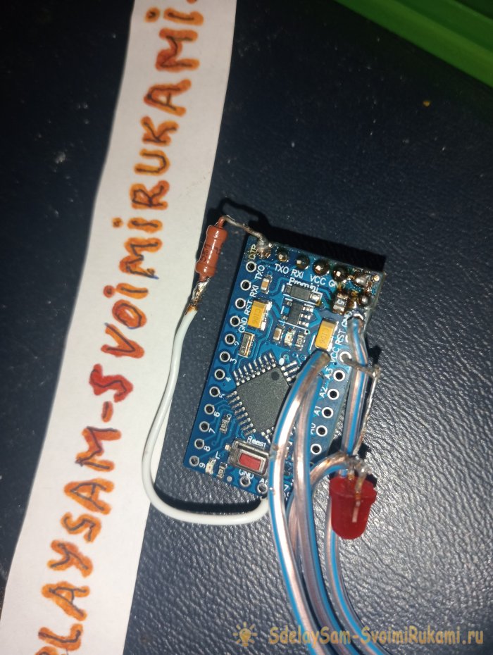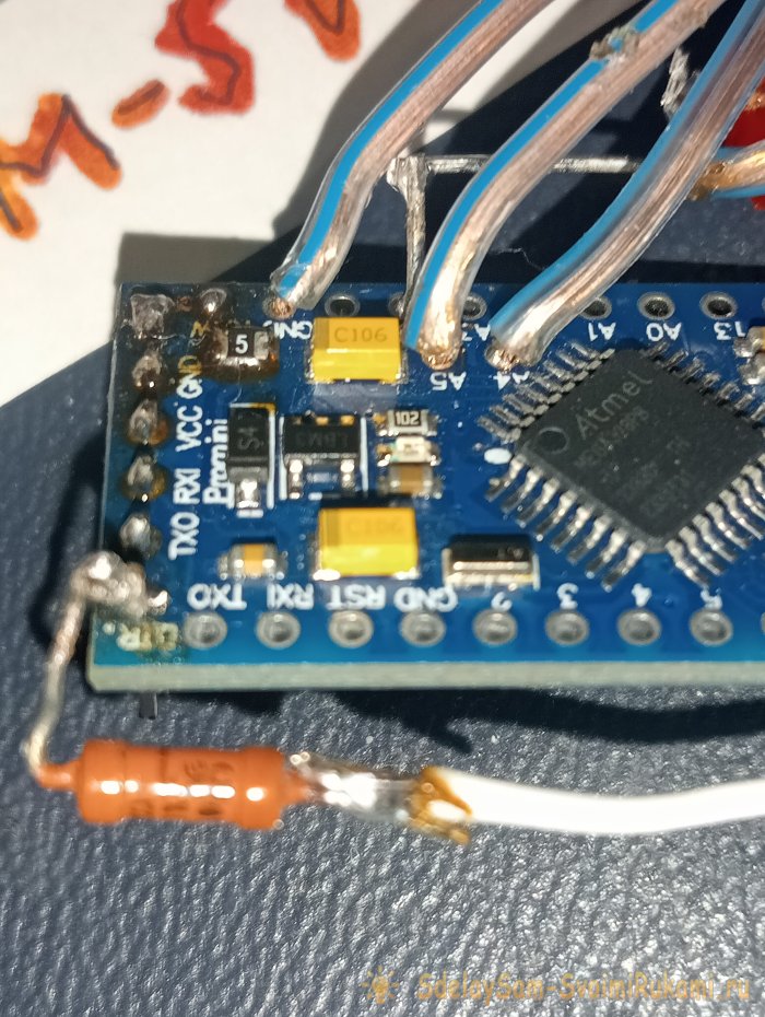 Обращу внимание, мне пришла плата «pro mini» без разводки контакта «DTR», поэтому, для нормальной прошивки я соединил пин «DTR» через резистор к не земляному контакту кнопки сброса. Обычно это не нужно. Также подключил плюсовой вывод датчика через красный светодиод, на всякий случай, это тоже совершенно не обязательно.