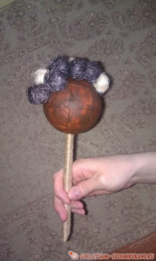 Теперь возьмем пластмассовый шарик и проделаем в нем отверстие ножницами, чуть меньшее, чем диаметр получившегося у нас ствола. Красим шарик акриловой краской. Когда краска высохнет, берем ствол нашего топиария и вставляет его в шарик до упора. Начинаем приклеивать шарики из сизали к нашему пластмассовому шару. Клеить можно так как душе угодно, как в хаотичном, так и в симметричном порядке.