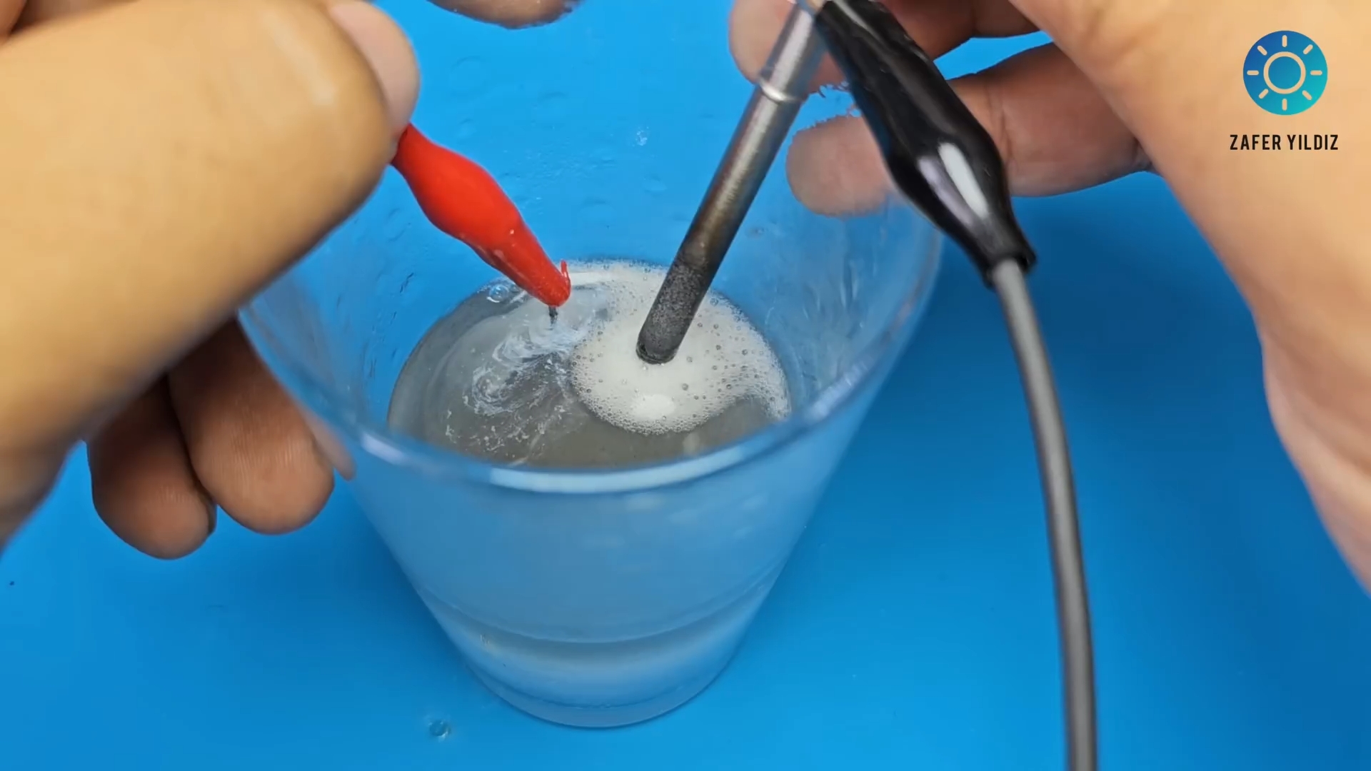 Для эксперимента, ко второму, минусовому выводу блока подключим очищенную медную проволоку. Включим блок и опустим электроды в раствор.
