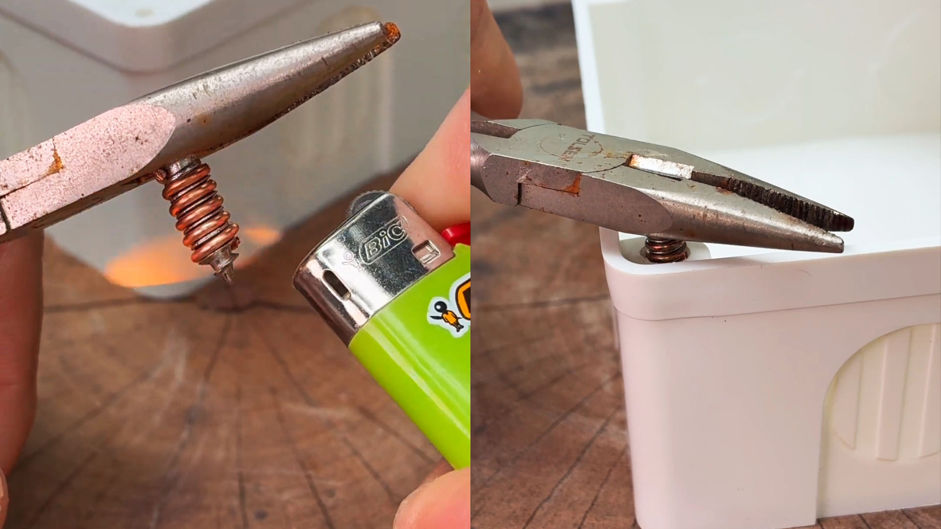 Держа саморез с проволокой за шляпку кусачками, нагреваем его зажигалкой. И устанавливаем в сорванное отверстие.
