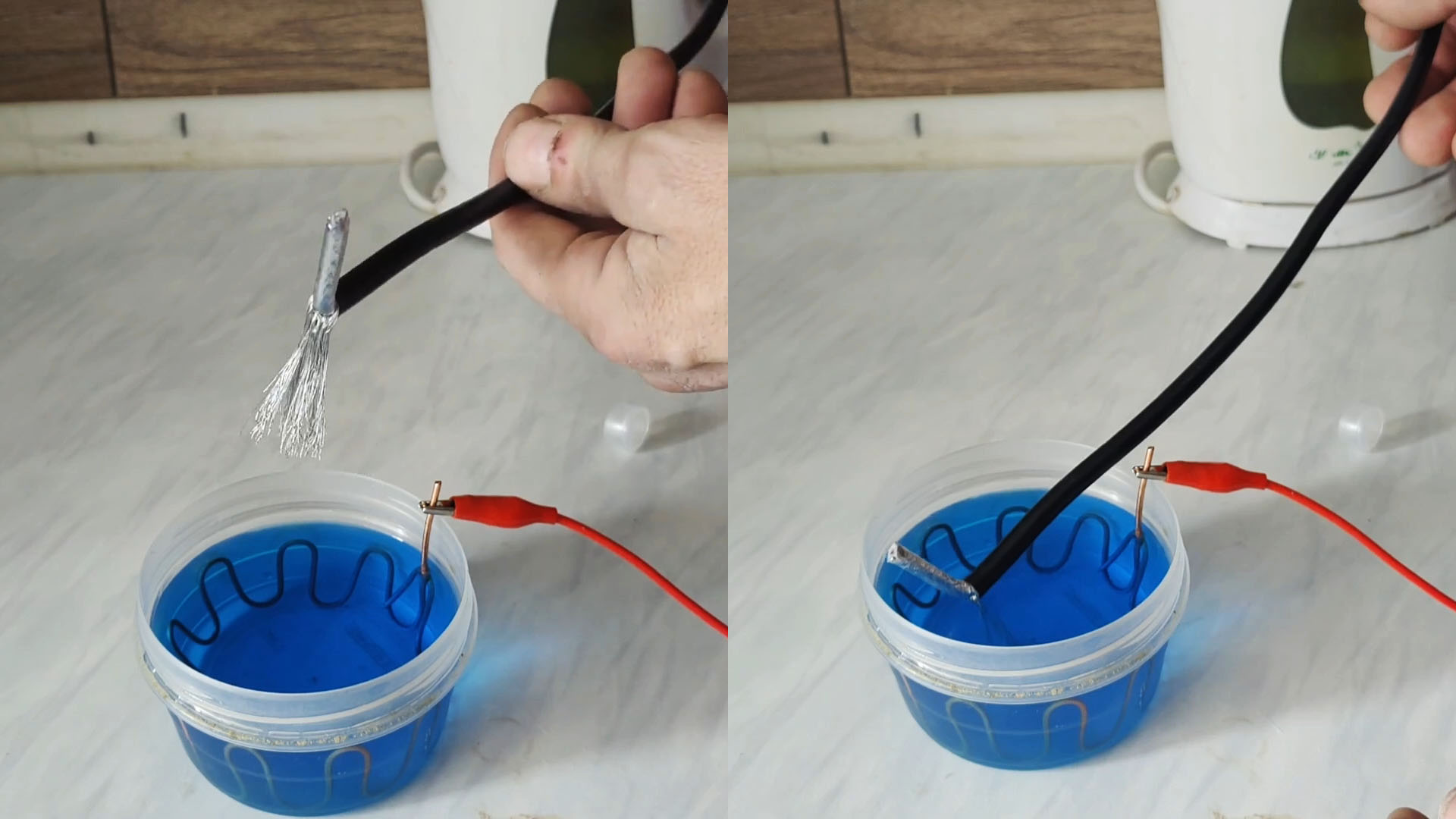Наливаем раствор в емкость. Плюсовой вывод от блока подключаем к медной проволоке. Минусовой вывод подключаем к металлу, который необходимо покрыть медью. Опускаем его в раствор.