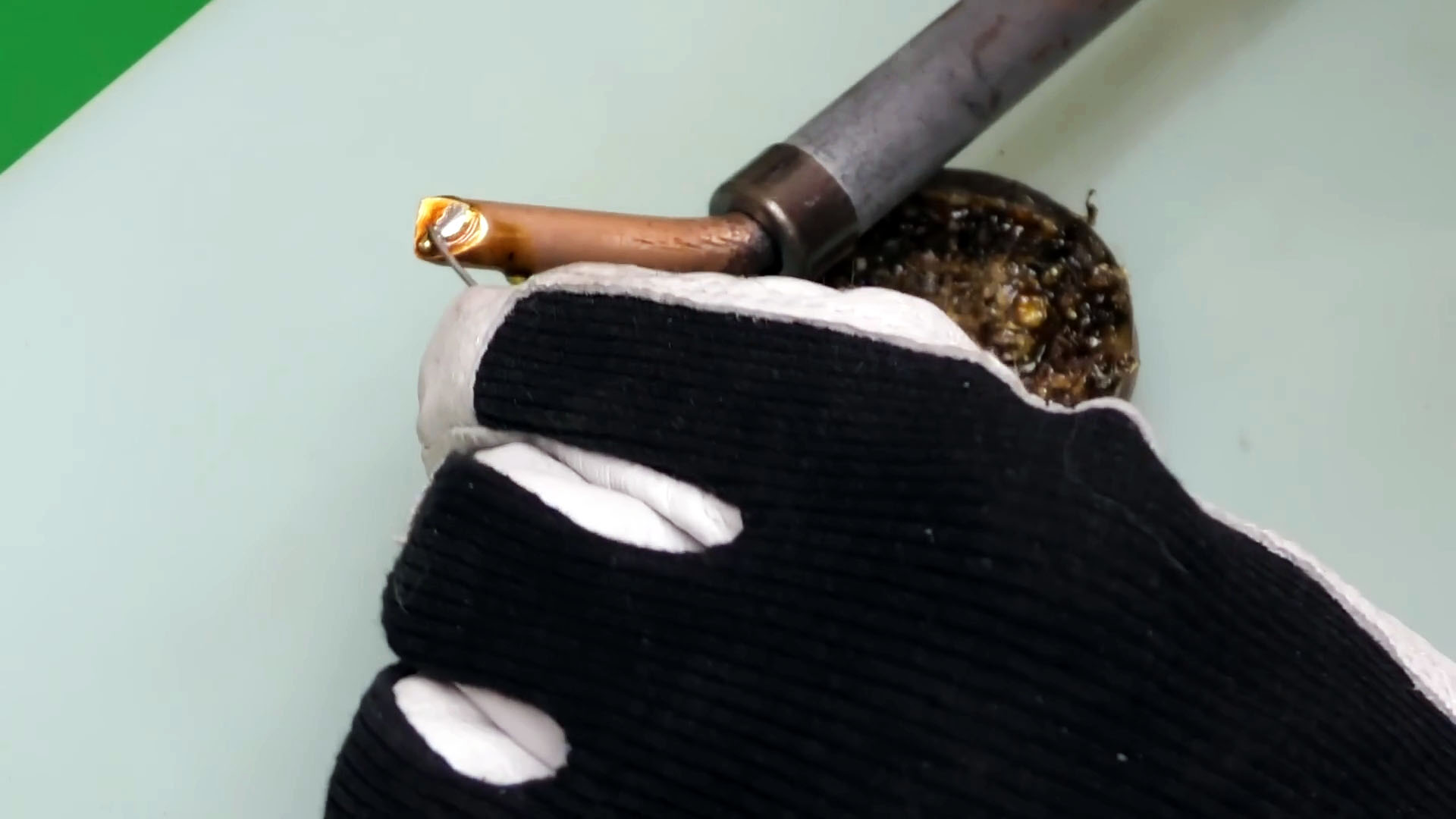 Но не трогайте рабочую зону — она уже готова к работе. Затем включите нагрев и посмотрите, как медь меняет цвет и темнеет, образуя защитный оксидный слой. По такому жалу припой не растекается, залуженной остается только рабочая область. Работать таким паяльником проще, а пайка будет аккуратнее.
