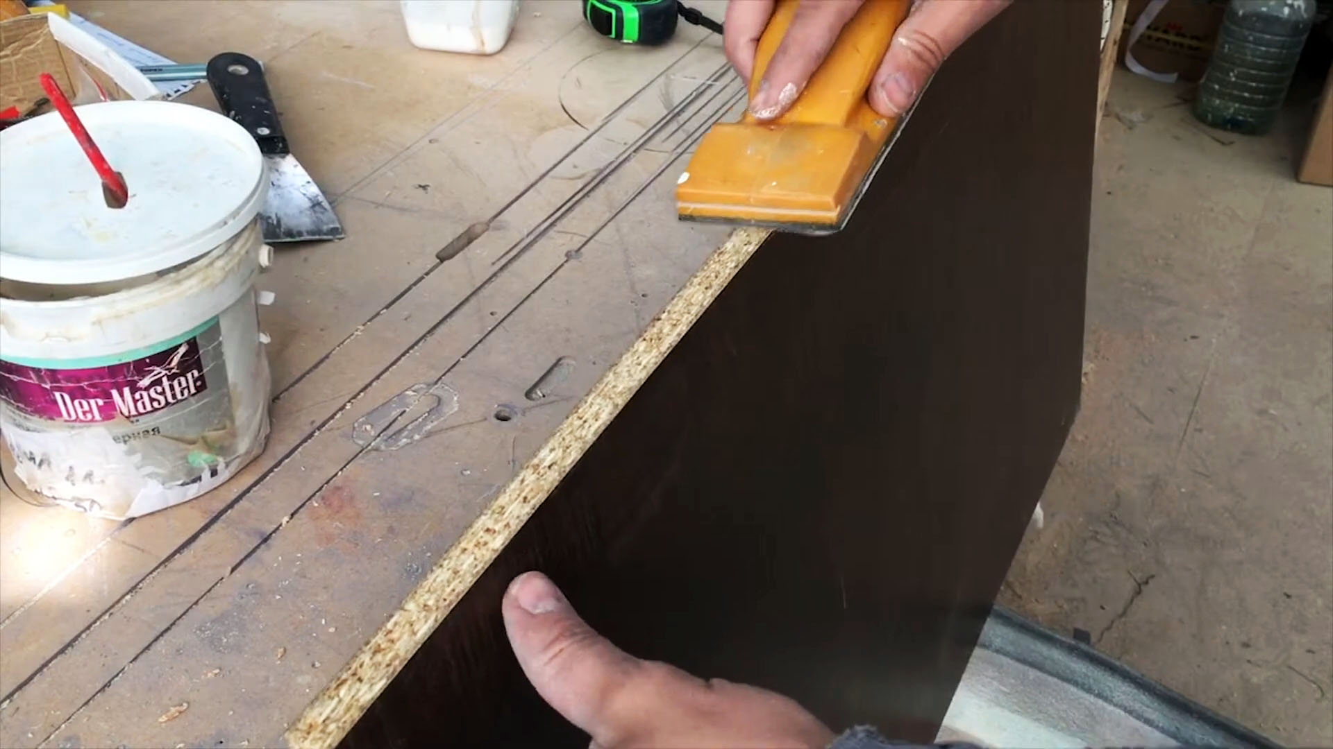 Клей, попавший на пластик, легко удаляется как до, так и после поклейки кромки. Я делаю это шпателем, который не затачиваю с одной стороны, чтобы не царапать или резать пластик.