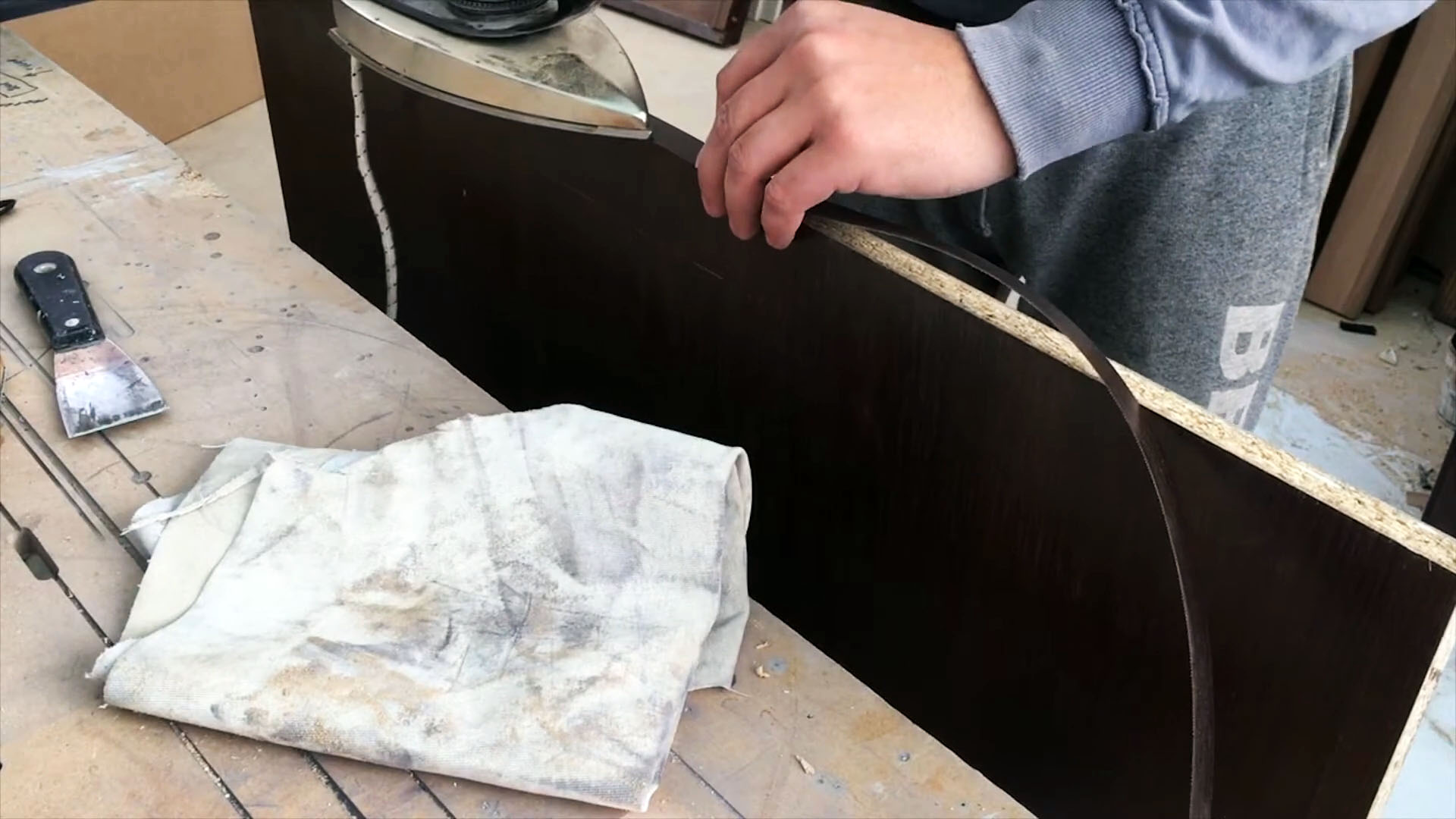 Когда клей высох, я выравниваю и прихватываю кромку утюгом. Важно настроить утюг так, чтобы он не перегревался, иначе кромка пойдет волнами. Также нужно хорошо выровнять и отшлифовать поверхность, иначе она будет царапать кромку. После того как я прохожусь утюгом и прихватываю кромку, я начинаю клеить. Я давлю на утюг достаточно сильно, чтобы он хорошо прижал кромку к детали. Вслед за утюгом я придавливаю кромку тряпочкой. Тряпочка защищает от порезов и ожогов, а также помогает кромке быстрее остыть и не подниматься.