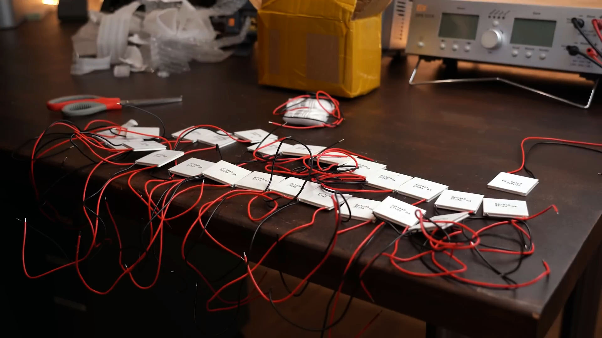 Затем я нанесу термопасту на модули и размещу 21 из них на алюминиевом слое. Я укорочу и соединю провода модулей последовательно, используя каптоновую ленту для предотвращения короткого замыкания.