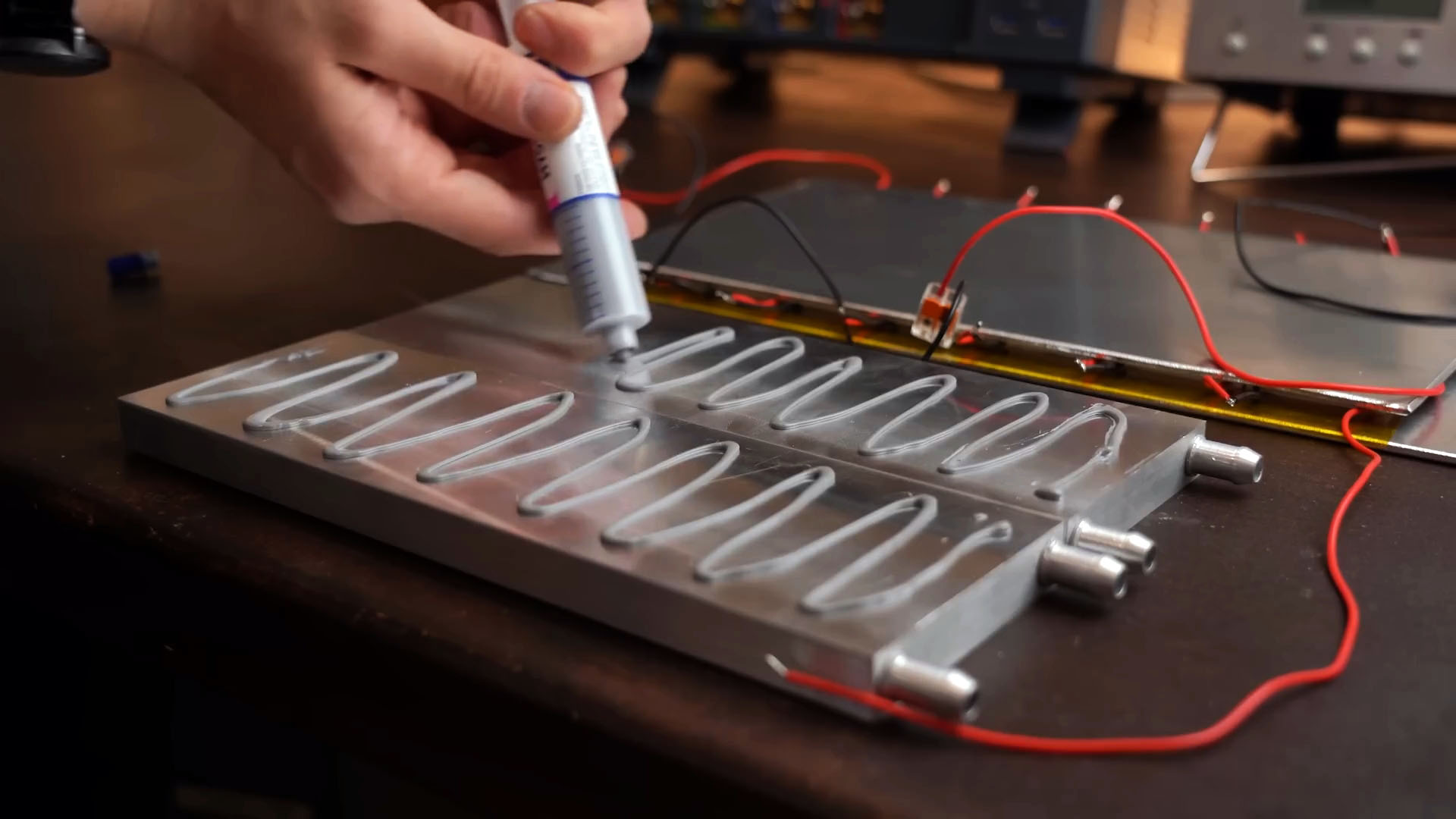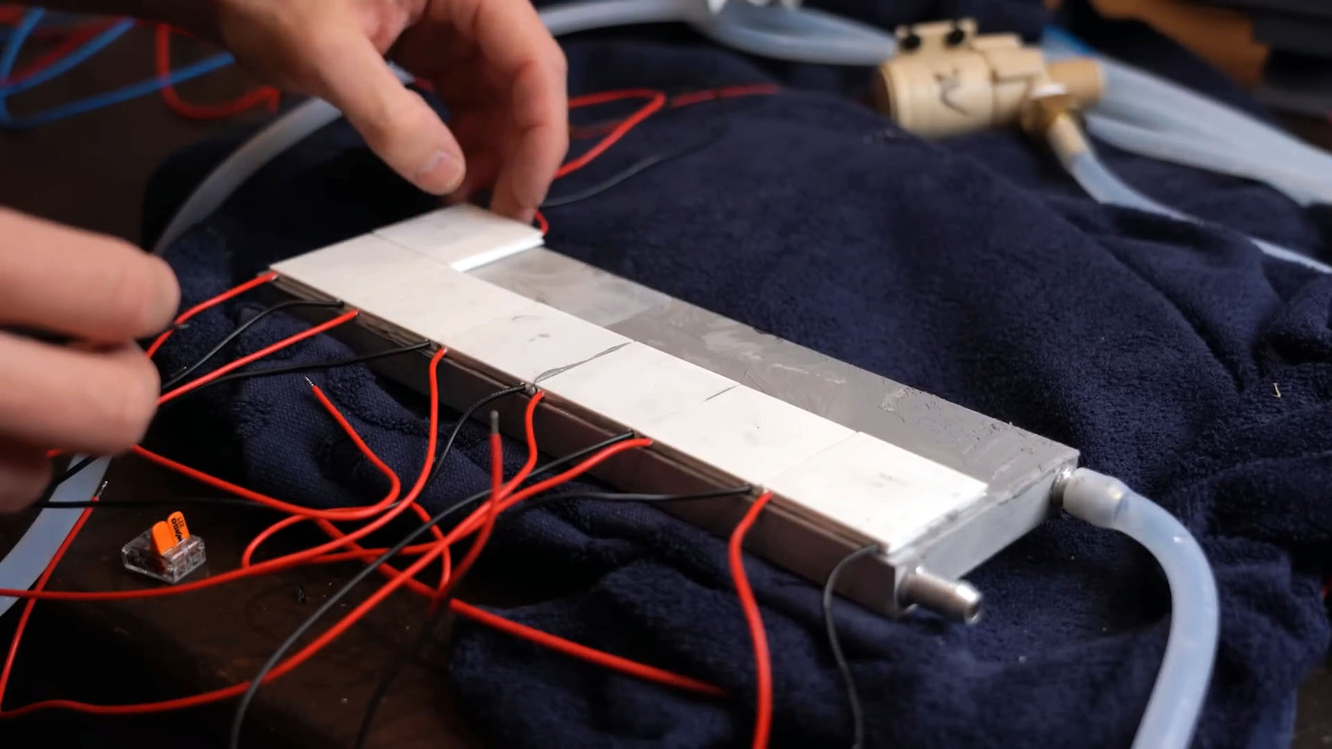 Я прикреплю меньший кусок алюминия к холодной стороне с помощью термопасты. Проверка показала, что система работает: выходное напряжение позволяет питать светодиод. Для улучшения охлаждения я развернул два алюминиевых блока для водяного охлаждения, добавив термопасту и соединив их трубками.