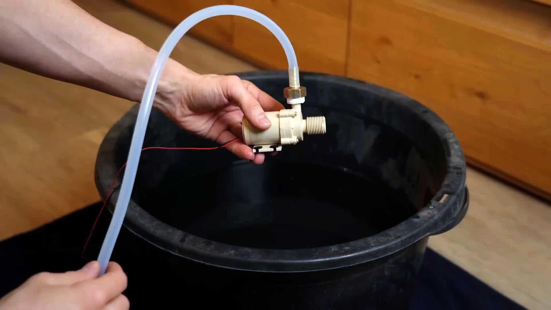 Я наполнил ведро дождевой водой и опустил туда погружной насос на 12 В.