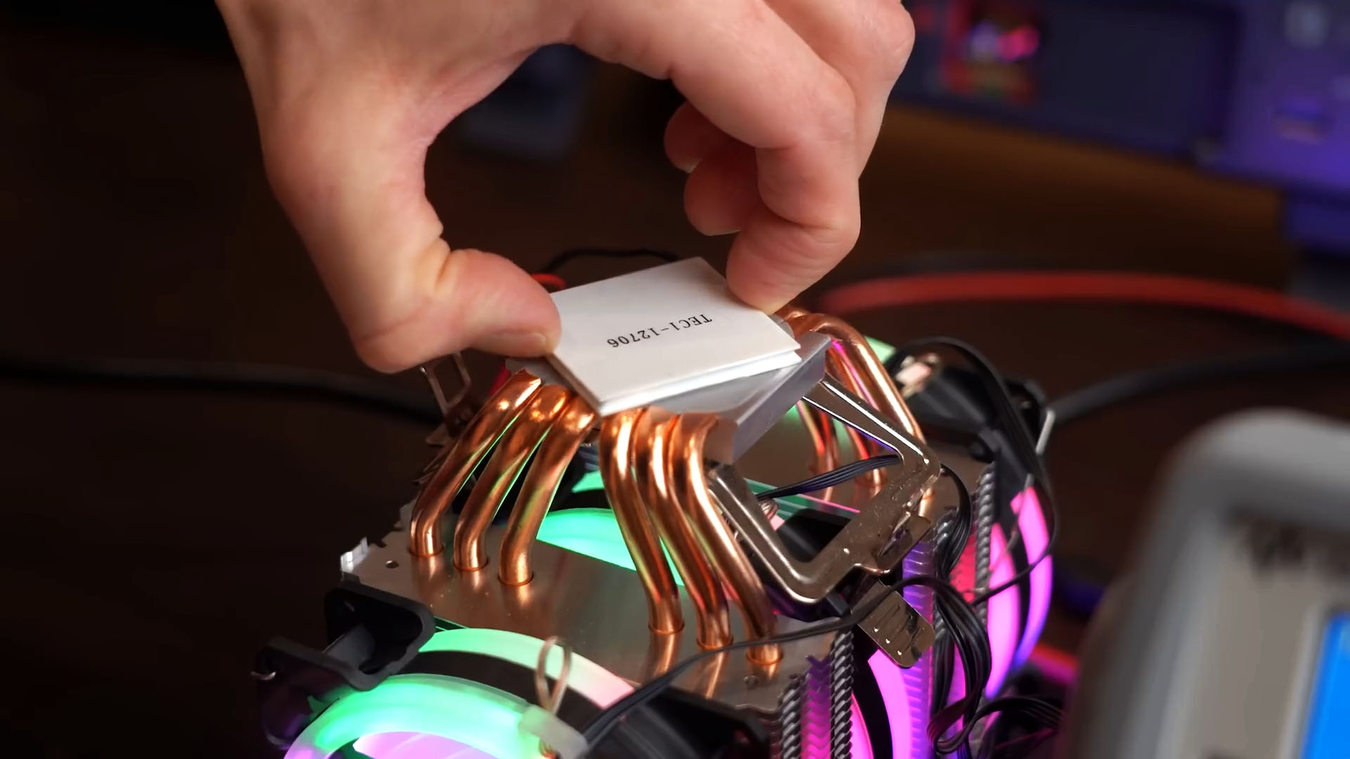 Я хотел провести тесты, подавая одинаковую постоянную температуру на горячую и холодную стороны, измеряя напряжение холостого хода и ток короткого замыкания. Но поддерживать постоянную температуру горячей стороны оказалось сложно, поэтому я решил поддерживать теплую сторону при комнатной температуре с помощью кулера для процессора.