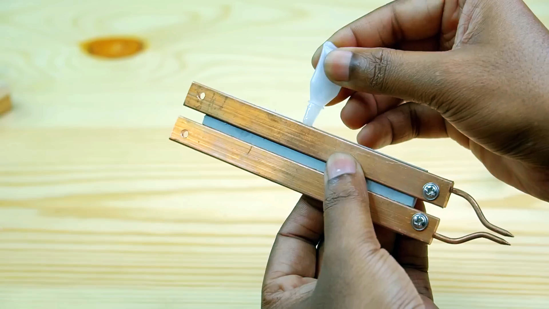 Зажимаем электроды в шине, предварительно изогнув.
