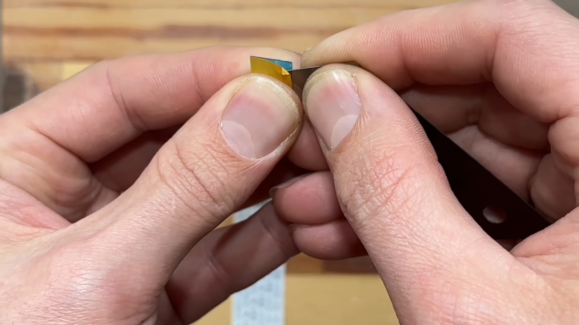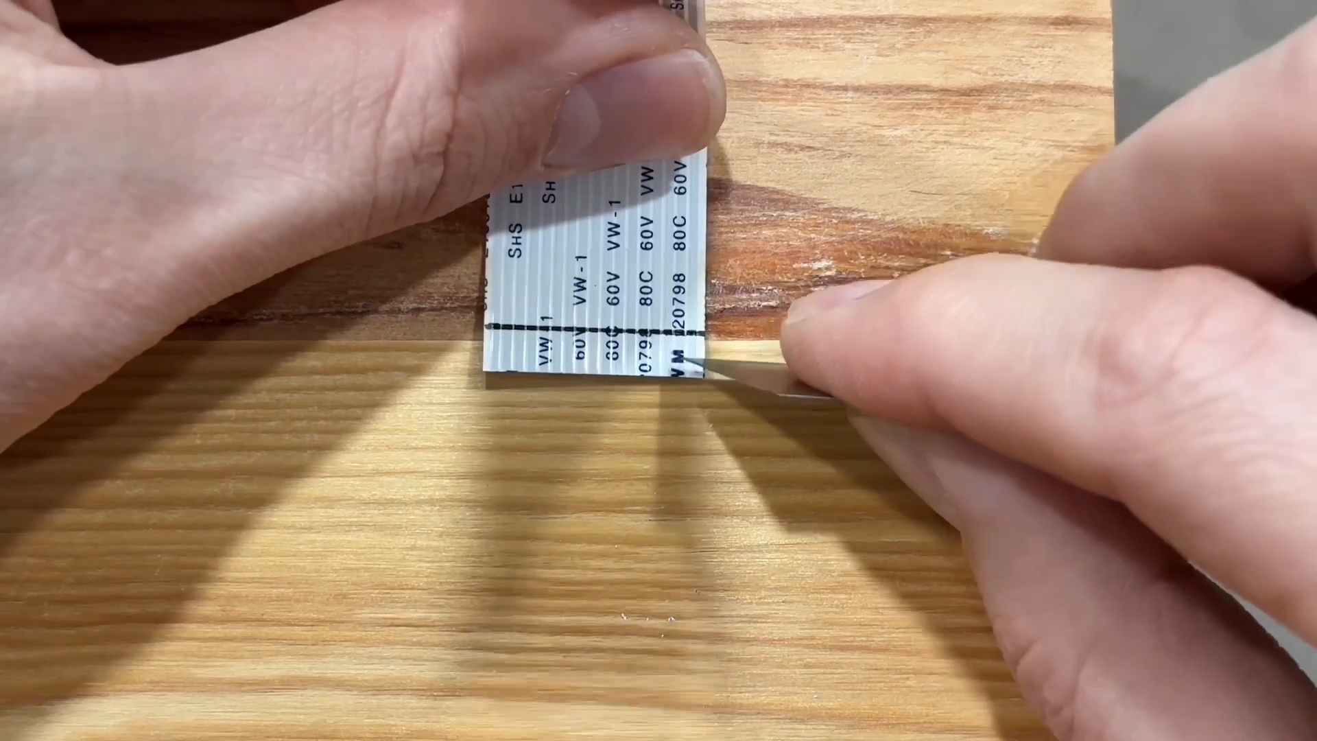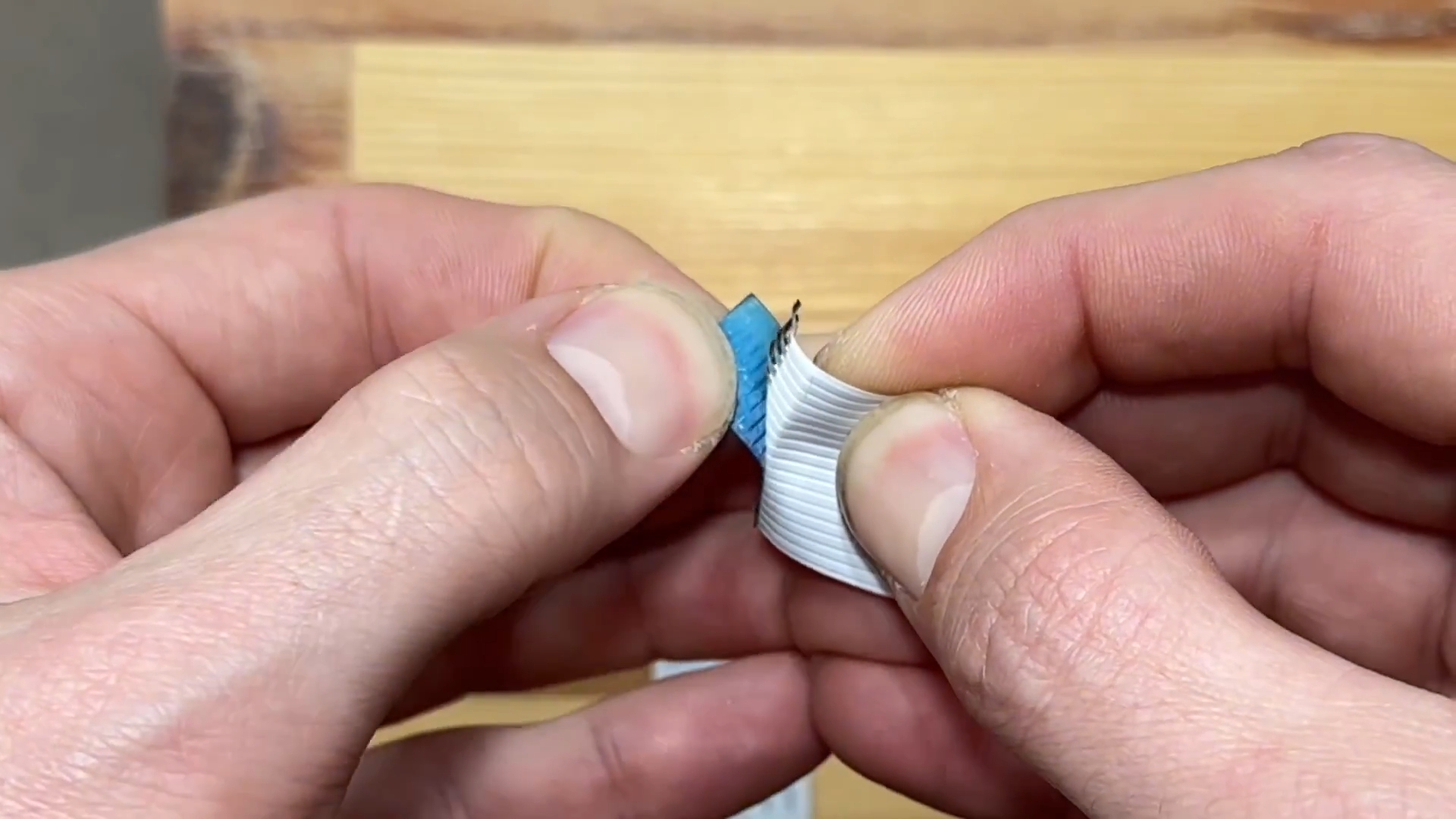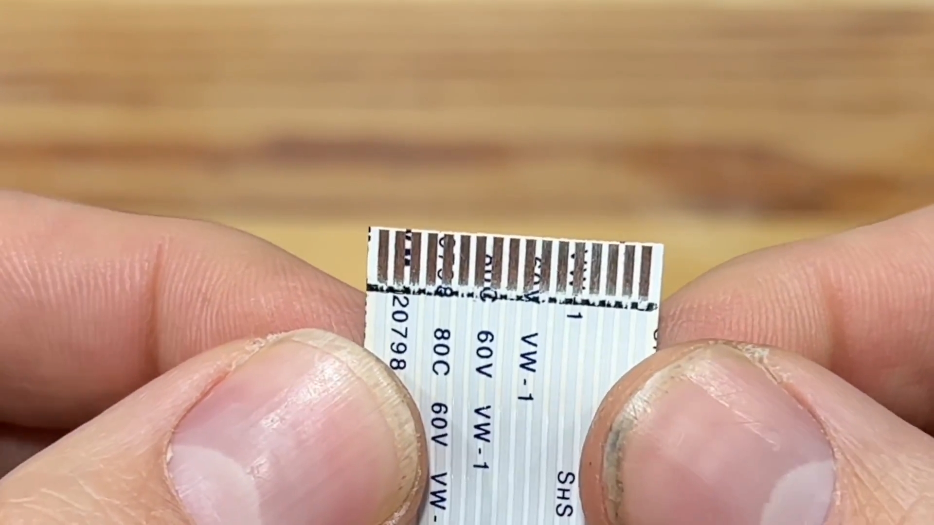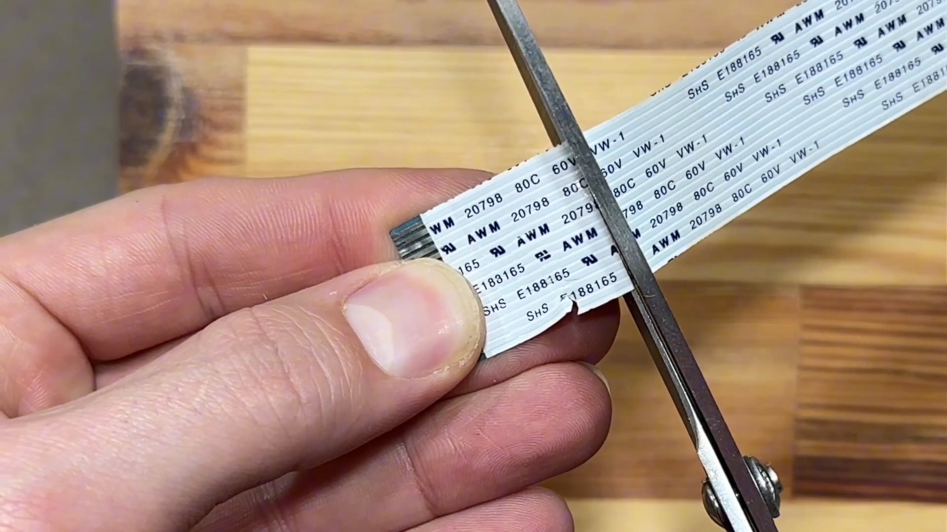 Далее на твёрдой и ровной поверхности располагаем шлейф и при помощи лезвия от канцелярского ножа поочерёдно зачищаем один контакт за другим.