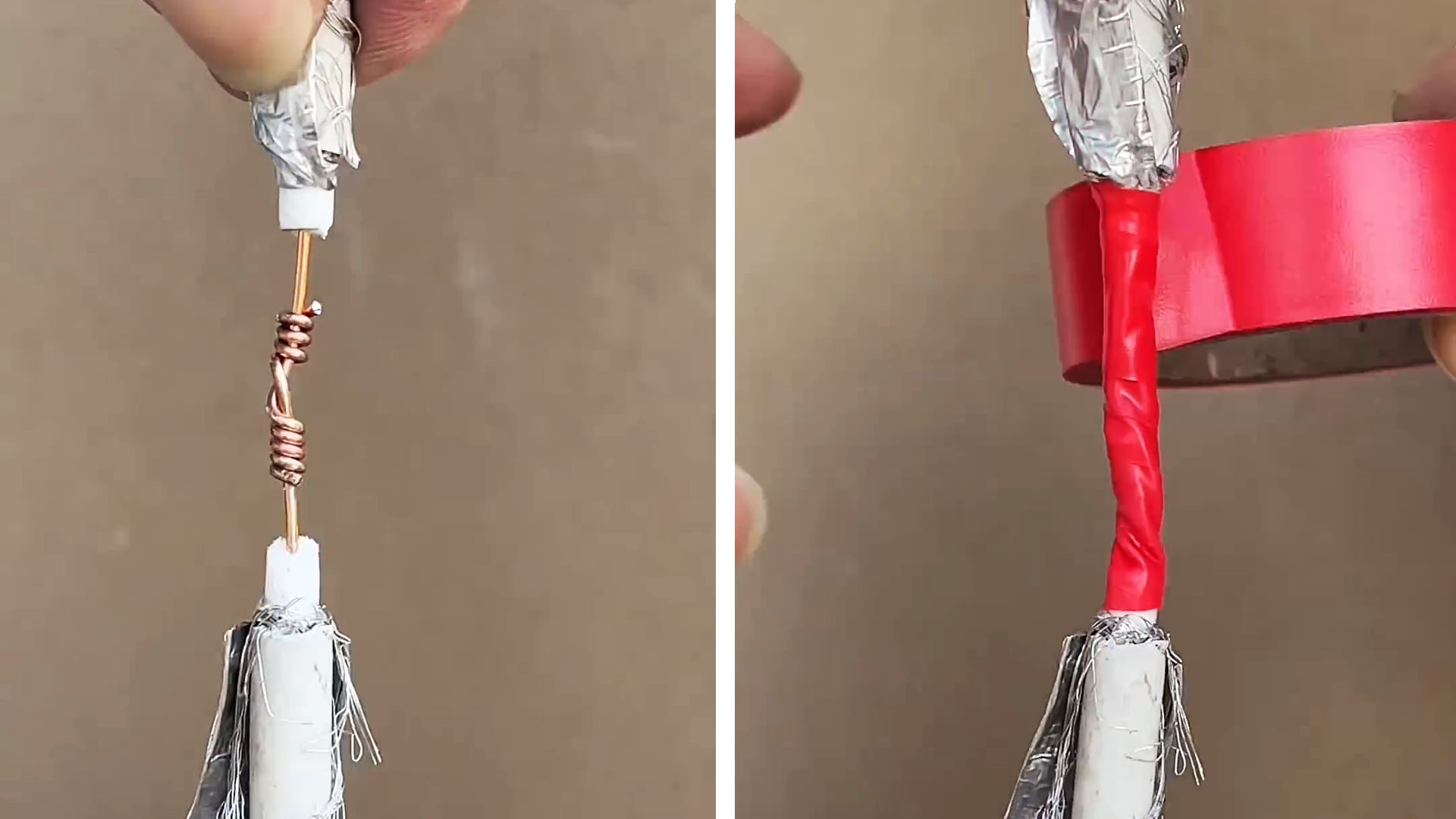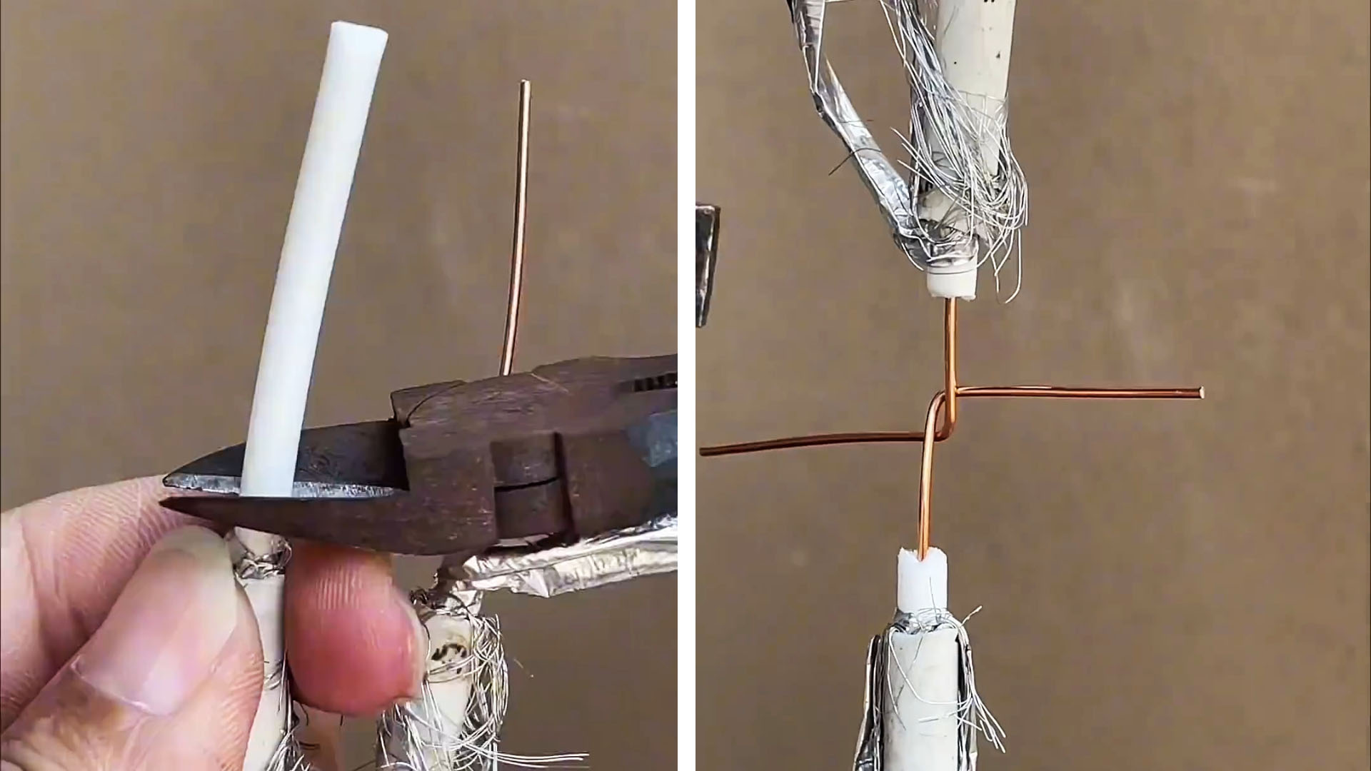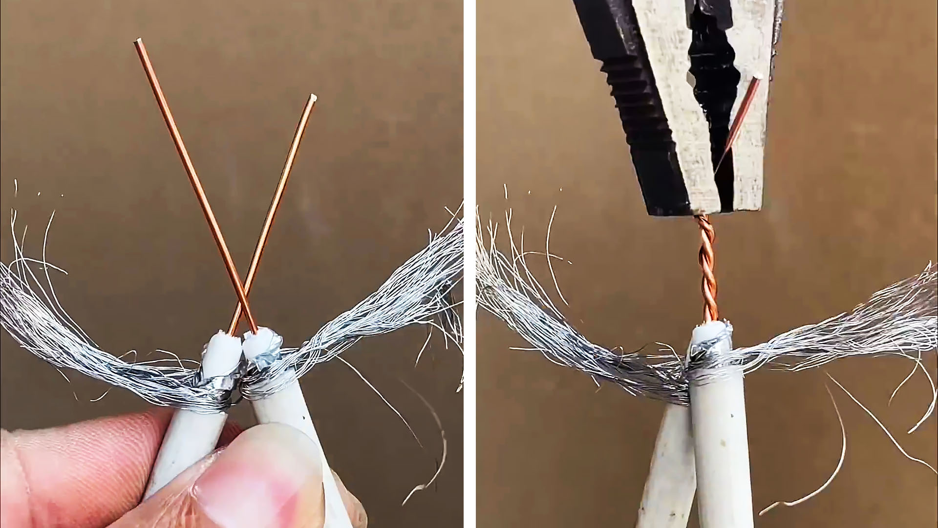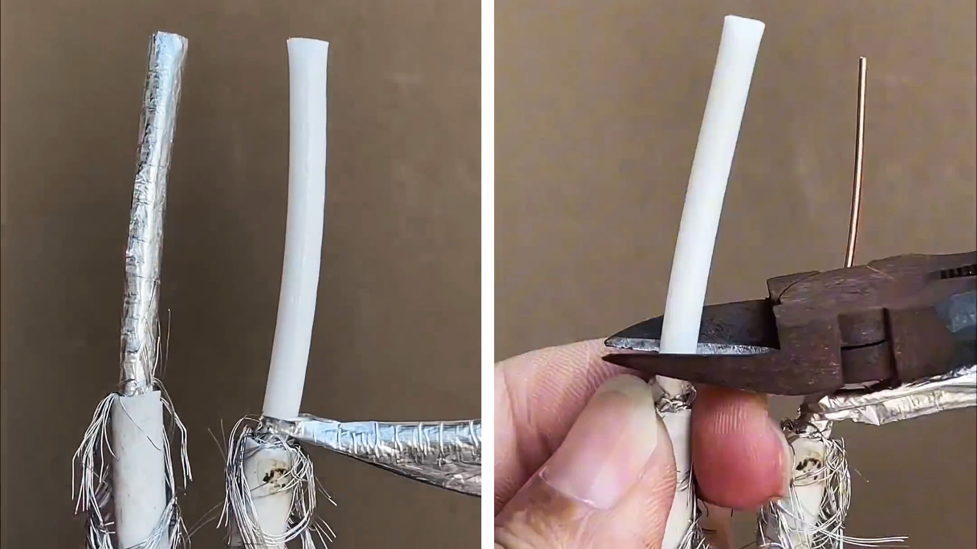 Если у вас нет в наличии специального соединителя для экранированных проводов, то данный полезный совет подойдет как нельзя кстати. При помощи нехитрого способа можно надежно соединить телевизионный кабель без пайки и спец. муфты. Вам потребуется только изолента, канцелярский нож и плоскогубцы.
