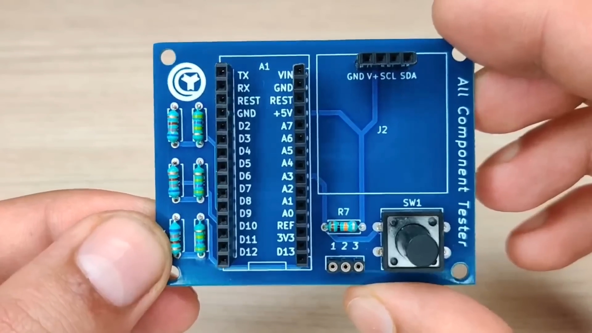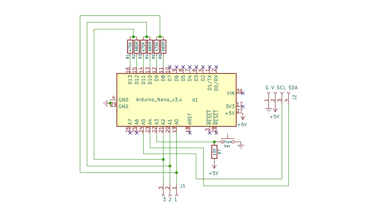 Сначала я разработал простую схему с Arduino Nano V3, подключённую к OLED-дисплею. Разъем для проверки деталей подключен к выводам Arduino Nano через резисторы, а кнопка запускает тестирование каждого компонента.
