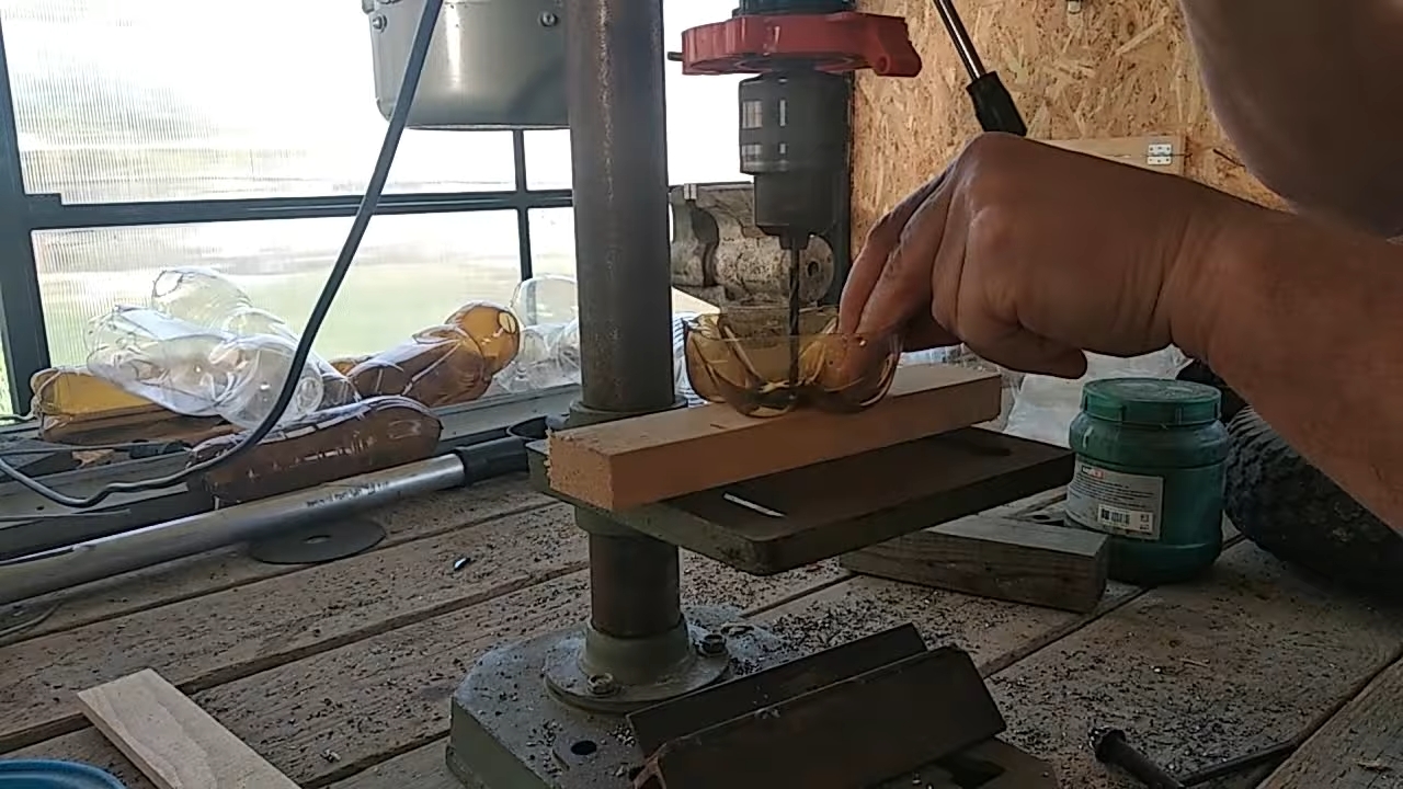 Первым делом необходимо сделать вертушку из донышка бутылки. Отрежьте низ у ПЭТ бутылки. Затем в центре донышка просверлите отверстие сверлом нужного диаметра — разметка не нужна. Если впадины нет, сначала отметьте центр.