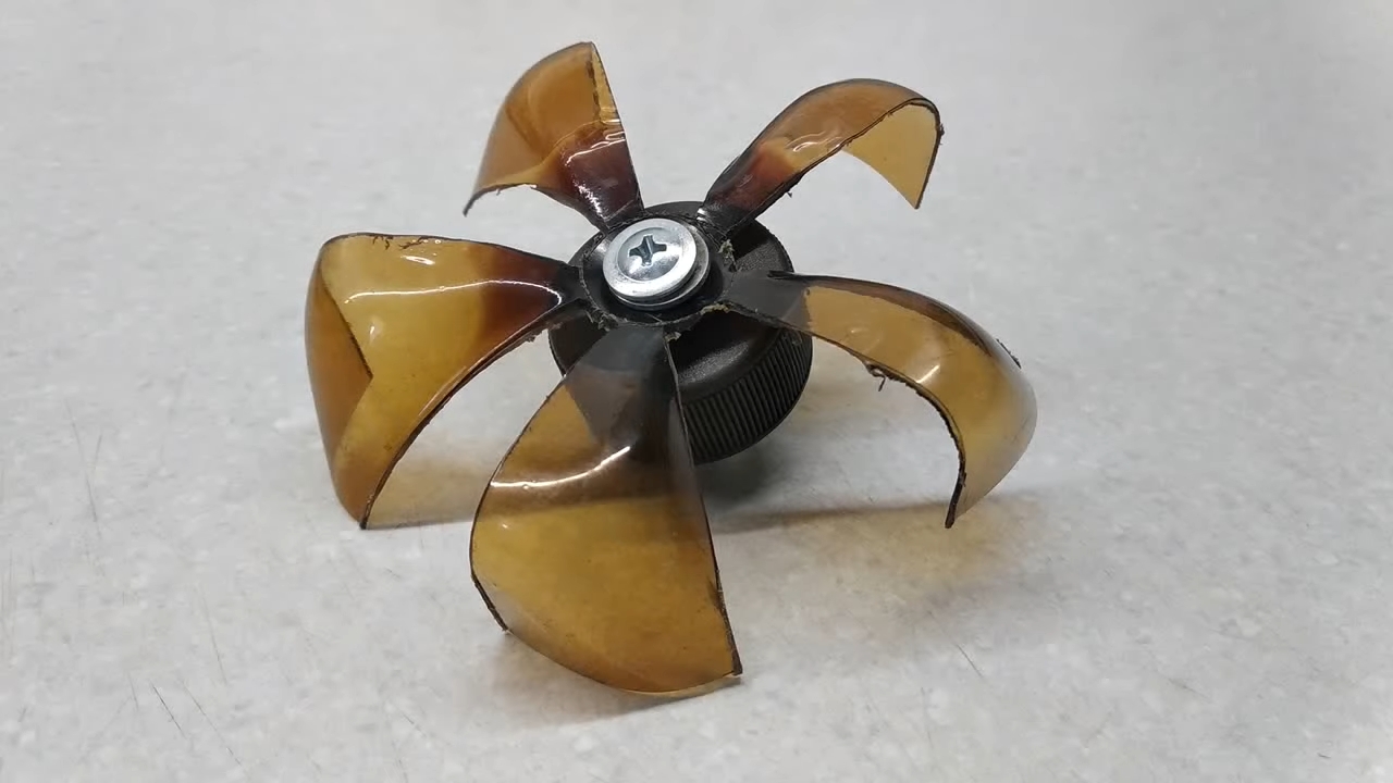 Теперь соберите отпугиватель целиком. Вертушку привинчиваем саморезом к одной из крышек, оставляя свободный ход для вращения.