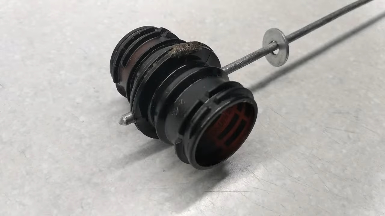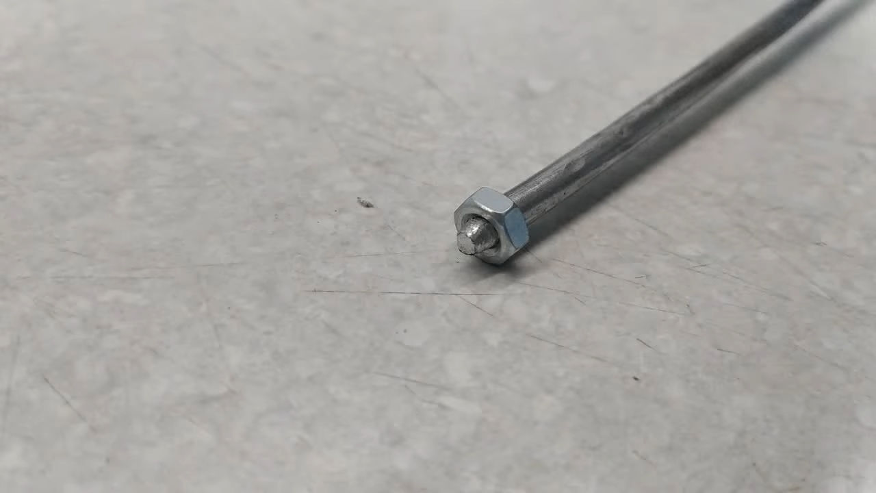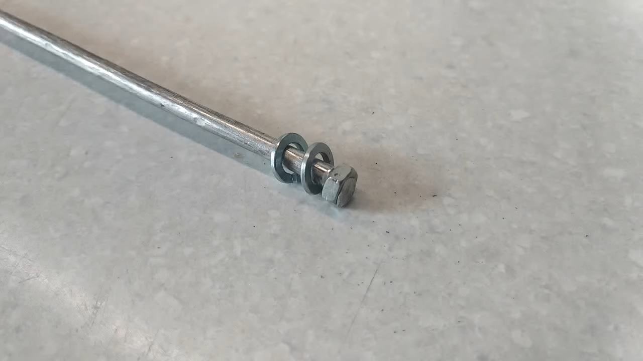 Далее подготовьте стержень: отрежьте проволоку длиной 85 см, обработайте концы напильником. На один конец наденьте широкую шайбу под М5 и гайку М3, а потом развальцуйте кончик — так гайка зафиксируется.