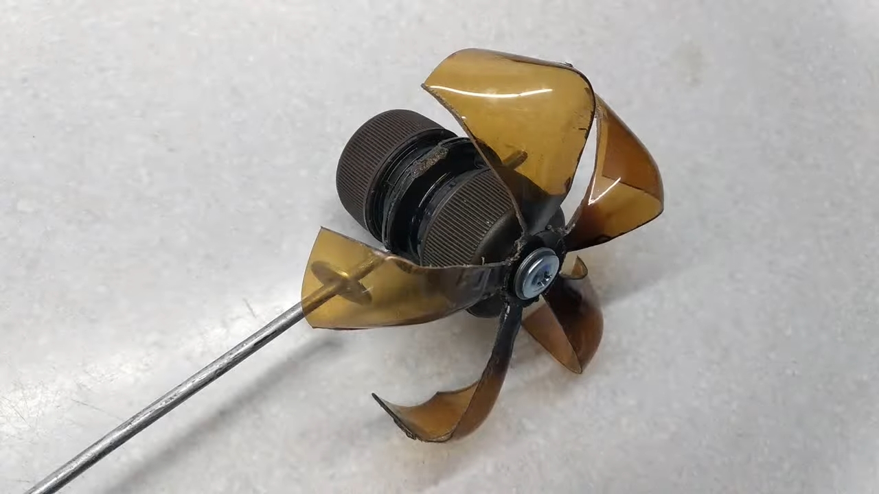 В центре одной из горлышек просверлите отверстие под проволоку и закрепите на ней основание вертушки саморезом М4.