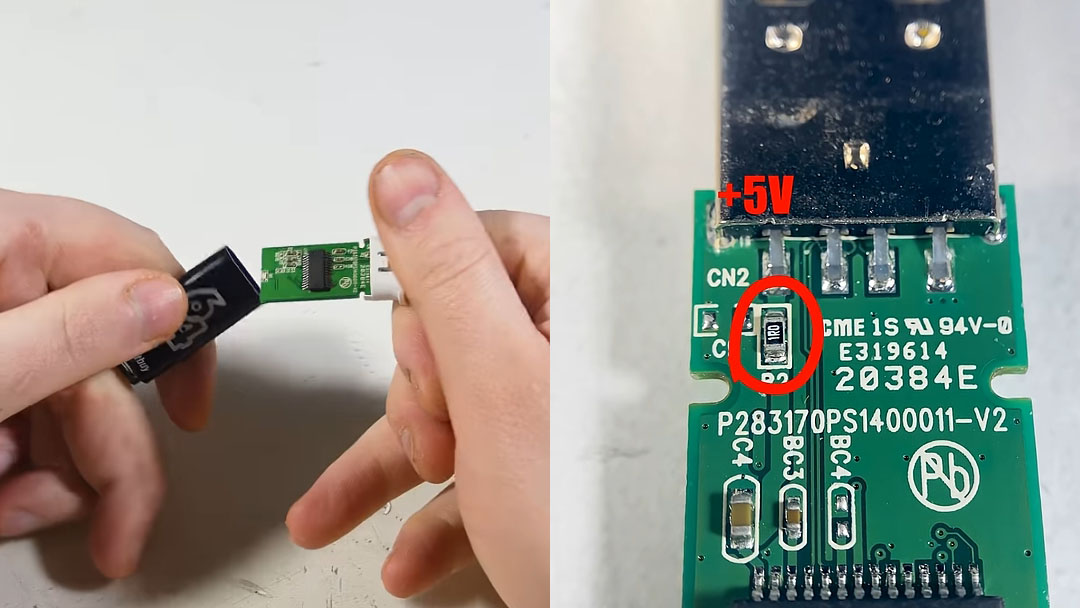 Я разобрал обычную флешку и установил геркон в разрыв плюсового контакта, заменив им одноомный резистор.